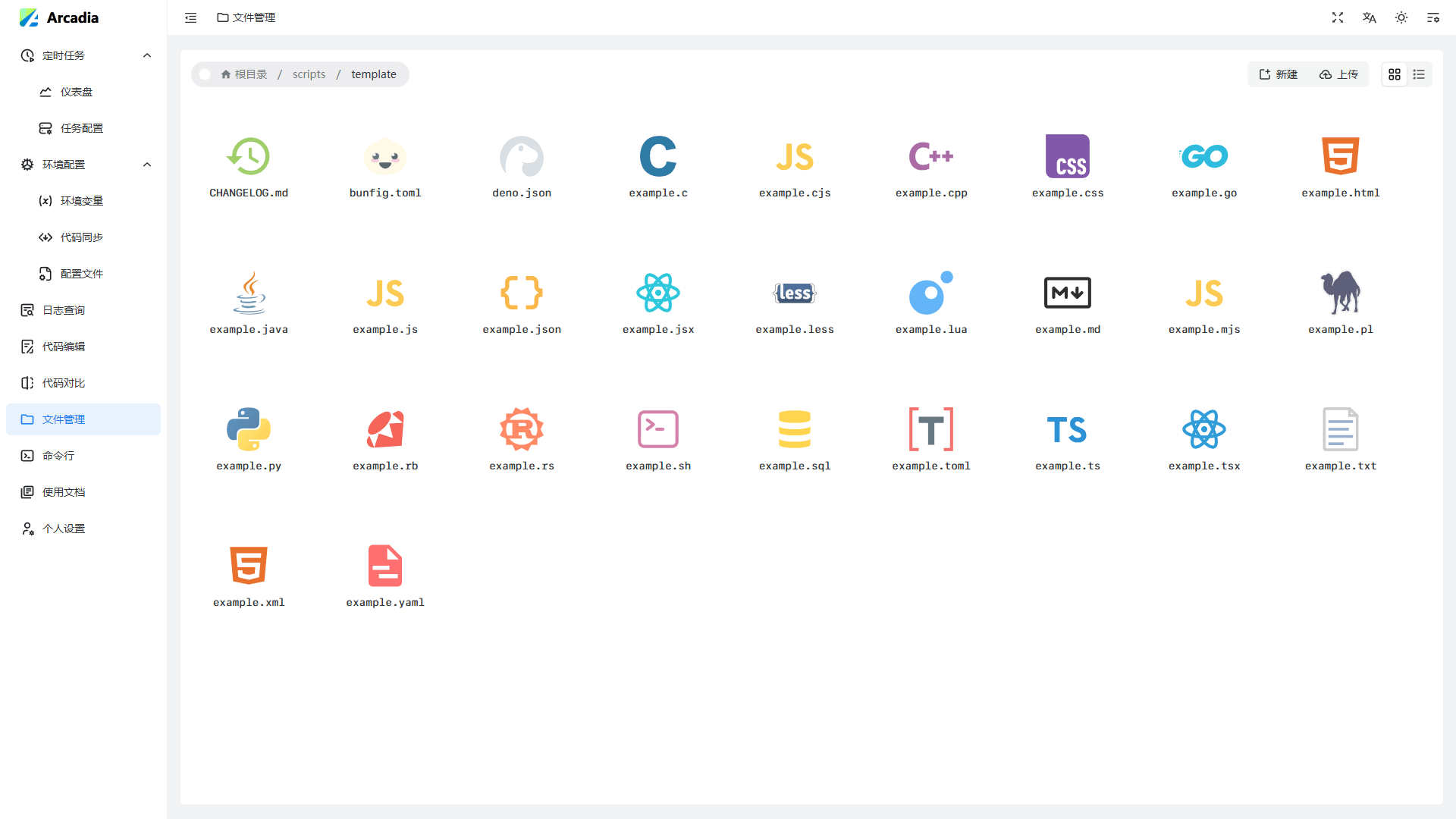 仿桌面系统的文件管理页面,设有平铺和列表两种视图,支持创建、删除、重命名、上传、下载、删除、编辑等操作。